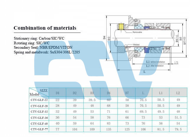 Phớt cơ khí CTV-GLF-28 được sử dụng cho các bơm trục đứng đa tầng cánh có cột áp cao, áp lực làm việc lên tới 40 bar được sử dụng cho bơm trục đứng của các hãng như: Grundfos, Ebara, CNP, Pentax, Sealand, Paragon, Dragon, Wilo, Lowara, ... Và các hãng bơm có kết cấu phớt tương tự